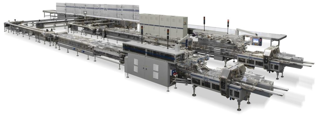 The system consists of a high-speed distribution unit that takes the rows of dry and sandwich biscuits from the cooling tunnel and delivers them to a double 2-leg packaging line for piling/grouping and wrapping the product in flowpack.